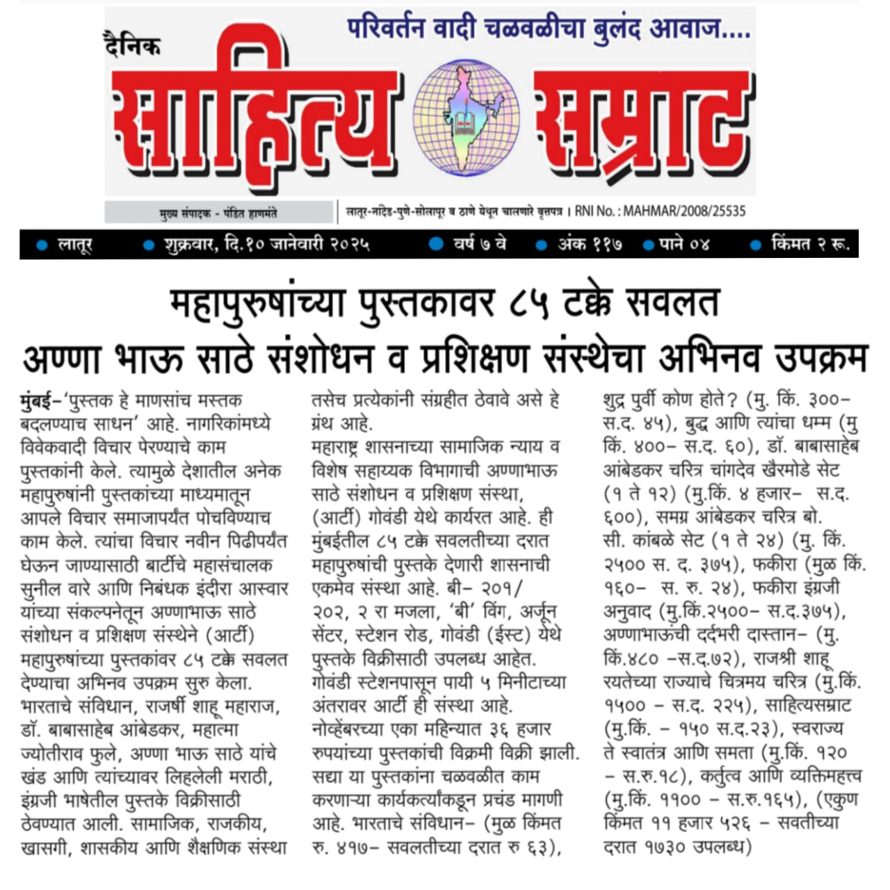 Sahitya Samrat - 85 percent discount on books of Mahapurusha An innovative initiative of Anna Bhau ...